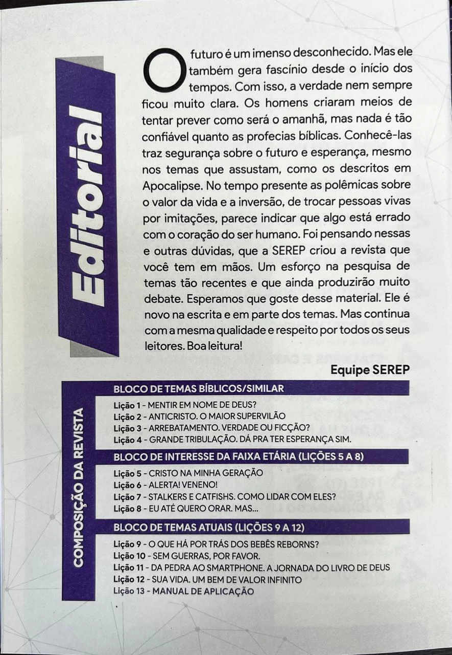 O futuro é um imenso desconhecido. Mas ele também gera fascínio desde o início dos tempos. Com isso, a verdade nem sempre ficou muito clara. Os homens criaram meios de tentar prever como será o amanhã, mas nada é tão confiável quanto as profecias bíblicas. Conhecê-las traz segurança sobre o futuro e esperança, mesmo nos temas que assustam, como os descritos em Apocalipse. No tempo presente as polêmicas sobre o valor da vida e a inversão, de trocar pessoas vivas por imitações, parece indicar que algo está errado com o coração do ser humano. Foi pensando nessas e outras dúvidas, que a SEREP criou a revista que você tem em mãos. Um esforço na pesquisa de temas tão recentes e que ainda produzirão muito debate. Esperamos que goste desse material. Ele é novo na escrita e em parte dos temas. Mas continua com a mesma qualidade e respeito por todos os seus leitores. Boa leitura!